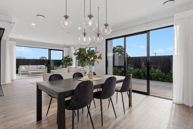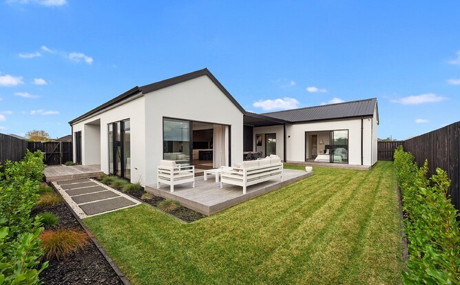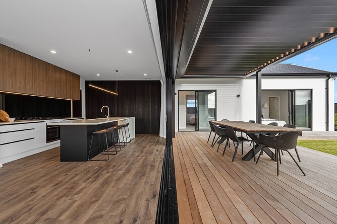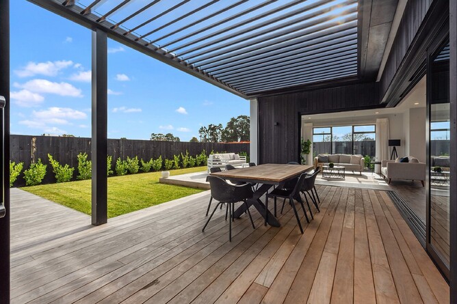 ‘This modern four-bedroom, two-bathroom home was designed as an entertainer’s dream. A fresh take on the classic pavilion-style layout, visitors are greeted by an Otago stone schist wall and large double door that connects to an open-plan living area. Start the morning with a coffee at the breakfast bar, or out on the deck with louvres that can be closed to make it an all-weather space. This west-facing spot is also a relaxing place to enjoy sunny afternoons…’